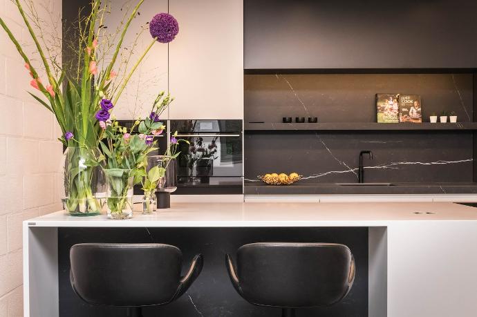 De verfijnde inbouwspots zijn strategisch geïnstalleerd zodat de lichtuitstraling de volledige kastruimte dekt. In combinatie met een ledstrip is de op maat afgewerkte keukenwand een ware eyecatcher. De indirecte verlichting zorgt voor een sfeervolle gloed over de marmeren spatwand.