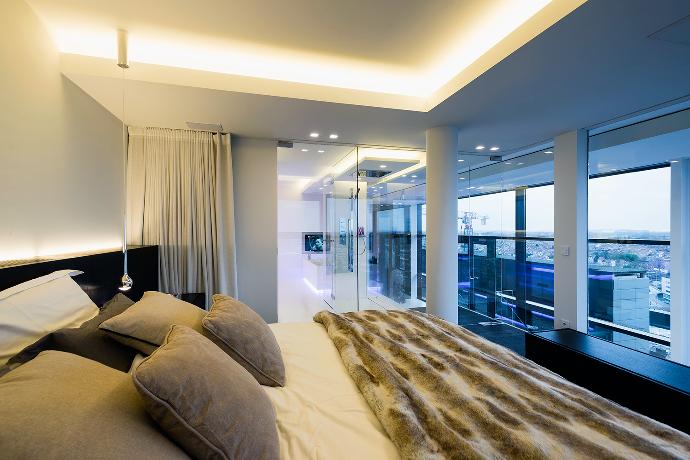 In de inkomruimte kiezen we voor vierkante inbouwspots om de hal praktisch te verlichten. De indirecte verlichting geeft een ruimtelijk gevoel inclusief een warme sfeer. Om van deze villa een ware eyecatcher te maken, is er geopteerd voor een RGBW-ledstrip. Zo is het mogelijk om met een simpele touch op de afstandsbediening van kleur te veranderen.